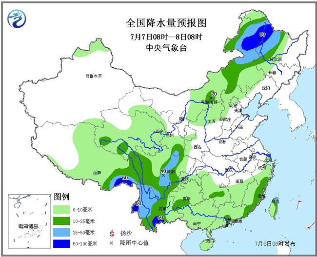 7日08时至8日08时,内蒙古中东部、东北地区西北部、江南东部、华南东南部、西南地区大部、青藏高原东南部等地的部分地区有中到大雨,其中,内蒙古东北部、黑龙江西部、云南南部和西部等地的部分地区有暴雨(50~80毫米);上述局地并伴有短时强降水或雷暴大风等强对流天气。