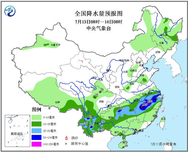 13日08时至14日08时, 江淮南部、江南中北部、西南地区大部、华南西部、黄淮中北部、黑龙江中部、西藏东南部等地有中到大雨,其中,云南中部、贵州东部、湖南西部、江西北部、安徽南部、浙江北部等地的部分地区有暴雨,局部地区大暴雨(100~130毫米);上述地区局地并伴有短时雷雨大风等强对流天气。