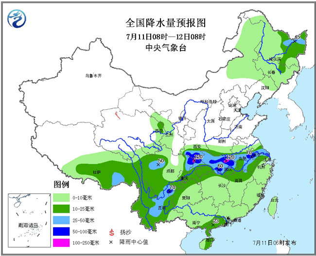 长江中下游地区四川盆地将有强降雨 中央气象台7月11日06时继续发布暴雨蓝色预警:预计,7月11日08时至12日08时,陕西南部、四川东北部、重庆北部、湖北大部、安徽中南部、湖南北部、江西北部、江苏南部、川西高原中部和南部、云南中北部、黑龙江东北部、西藏东南部等地的部分地区有大到暴雨,其中,四川东北部、湖北东北部的局部地区有大暴雨(100~120毫米);上述地区局地并伴有短时雷雨大风等强对流天气。