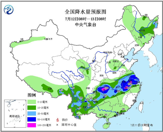 11~12日,华南、江南大部、黄淮、新疆等地的部分地区有35℃以上的高温天气,局部地区高温可达37~39℃。 未来三天具体预报 11日08时至12日08时,黑龙江东部、西藏中东部、陕西南部、四川盆地东部和南部、云南大部、江汉、江淮、江南北部等地有中到大雨,其中,四川盆地东北部、陕西南部、湖北东部和南部、安徽东南部、江苏西南部等地的部分地区有暴雨,局地有大暴雨(100~120毫米),上述地区局地并伴有短时雷雨大风等强对流天气。