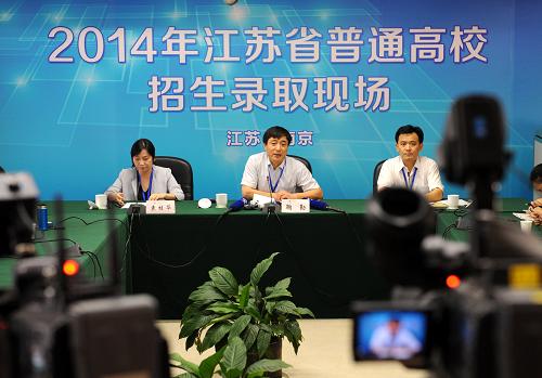 7月14日,江苏省教育考试院负责人在高校招生录取工作发布会上介绍录取工作安排、管理及本一批次院校投档情况。当日,2014年江苏省普通高校招生本科一批录取工作正式开始。本一批次共有全国167所文科类院校、245所理科类院校计划在江苏招生39912人,文、理两类院校的一次性投档满足率分别达到97%和95%左右。据介绍,2014年全国共有1454所高校计划在江苏招生37.88万人。新华社记者 孙参 摄