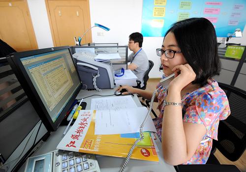7月14日,在江苏省教育考试院高校招生录取工作现场,工作人员在进行本一批次的录检与联络。新华社记者 孙参 摄