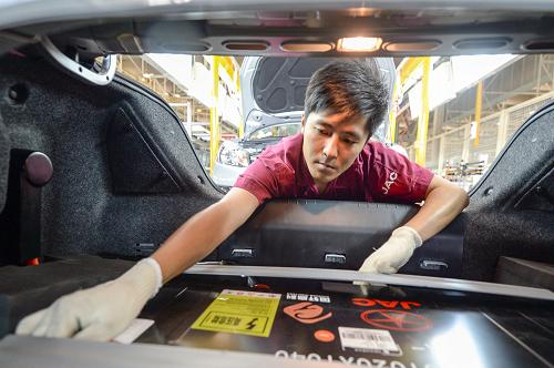 7月15日,在江淮汽车新能源汽车生产车间内,一位工人正在检查整车最重要的部分——电池箱。新华社记者 郭晨 摄 |