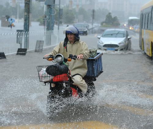 7月16日,市民骑车通过贵阳市区内的积水路段。新华社记者 陶亮 摄