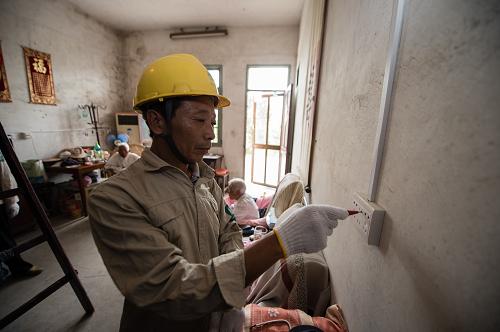 7月16日,在江苏南通平东镇新生村六组“百岁老人”钱有华家中,一名电力工人在排查插头安全隐患。为保障夏季用电安全,国网南通供电公司近期针对全市1000多位百岁老人家中的用电安全隐患,编制个性化服务档案,并安排专人定期、定向上门免费提供漏电检修、老旧电线更换等服务。新华社记者 李响 摄