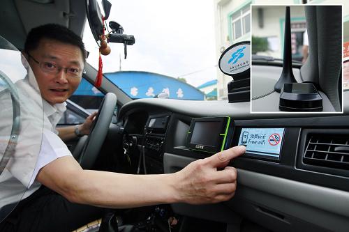 大图:一位大众出租车司机在讲解如何使用车载WiFi。小图:这是车内安装的车载WiFi天线装置(拼版照片,7月16日摄)。当日,2000辆贴有WiFi标识的上海大众出租车正式上路,乘客可通过车载WiFi享受免费上网服务,目前推出的WiFi服务平台支持安卓、苹果等操作系统。据悉,到今年10月,上海将有近9000辆大众出租车覆盖无线网络。新华社记者 丁汀 摄