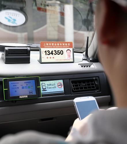 7月16日,一位乘客在出租车上使用免费WiFi。新华社记者 丁汀 摄