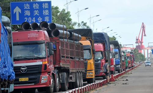 7月20日,过海汽车等待从海口秀英港过海前往广东湛江。当日,海南省气象台预报,琼州海峡海上风力将减弱至6级,所有客滚船于20日8时30分恢复通航。受2014年第9号台风“威马逊”影响,琼州海峡客滚船于7月17日8时起全线停航。新华社记者 赵颖全 摄