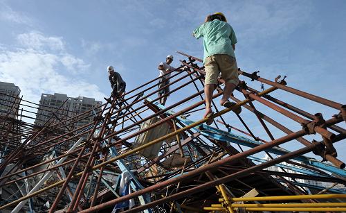 7月20日,工人在海口市滨海大道一处施工场地拆掉被台风损毁的工棚。海南省三防办统计数据显示,“威马逊”造成全省216个乡镇受灾,受灾人口325.829万人。全省倒塌房屋23163间,累计转移人口38.596万人,8人死亡,2人失踪。据统计,“威马逊”造成海南省直接济损失108.2824亿元,灾情发生后,社会各界齐动员,共同参与到抗灾自救中来。新华社记者 赵颖全 摄