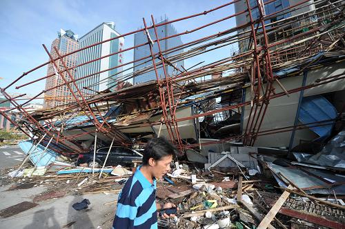 7月20日,一名工人从海口市滨海大道一处被损毁的工棚前走过。新华社记者 赵颖全 摄