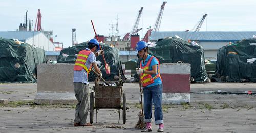 7月20日,工人在海口市秀英港清理垃圾。新华社记者 赵颖全 摄 |
