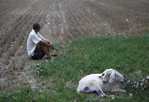 7月23日,在河南省平顶山市宝丰县商酒务镇任庄村,一名放羊的村民望着因墒情不足尚未播种的农田。近日,河南宝丰出现旱情,当地大田作物生长受到影响,部分农田因墒情不足无法播种。新华社发(何五昌 摄)