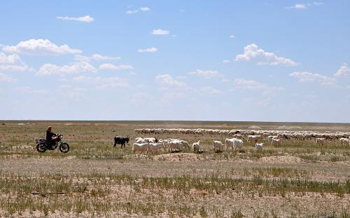 7月25日,一名牧民骑着摩托车在内蒙古自治区锡林郭勒盟苏尼特右旗境内的草原上放羊。新华社记者 于嘉 摄 |