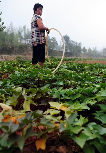 7月30日,河南嵩县城关镇的一位农民在用胶皮管为旱情严重的红薯地浇水。新华社记者 王颂 摄
