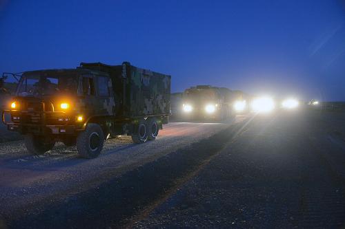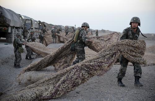 “火力-2014·库尔勒A”陆军兵种部队跨区基地化演练中,参演部队战场机动途中遇“敌”卫星空中侦察,部队迅速进行疏散隐蔽(7月28日摄)。“火力-2014·库尔勒A”陆军兵种部队跨区基地化演练日前在西北戈壁打响。新疆军区某训练基地和院校专家组成的“蓝军”,与第1集团军某旅展开对抗。新华社发(刘逢安 摄)