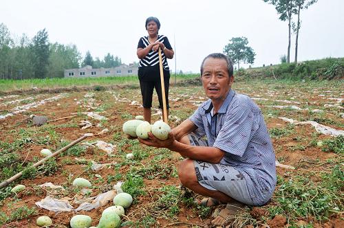 8月5日,在河南省洛阳市汝阳县上店镇庙岭村,张金海夫妇种的西瓜因干旱全部绝收。入汛以来,河南省遭遇持续高温,平均降雨量较多年同期均值偏少60%,多地出现严重的气象干旱。 目前,平顶山、许昌、洛阳等重点受旱地区旱情仍在持续加重,特别是随着水源不断减少,部分地区发生吃水困难,秋粮受旱面积不断扩大。新华社发(康红军 摄)