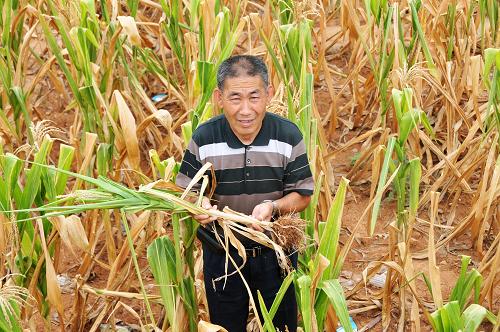 8月5日,在河南省洛阳市汝阳县上店镇庙岭村,村民张状站在已经枯黄的玉米地中。新华社发(康红军 摄)