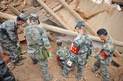 8月5日,救援人员在鲁甸县龙头山镇转运一名遇难者遗体。 当日是地震第三天,近万名官兵已全部到达鲁甸地震3个重灾县13个重灾乡镇,全力展开生命搜救和转移伤员。目前,救灾部队共救出200余人、转移伤员近500人、转移安置受灾群众1万余人、搬运物资450余吨、搭建帐篷200余顶。据成都军区抗震救灾联合指挥部介绍,救灾部队下一步将抓住72小时黄金救援期,继续把抢险救人放在第一位,同时突出道路保通、堰塞湖隐患排除、救灾物资运送、受灾群众安置等。新华社记者 薛玉斌 摄