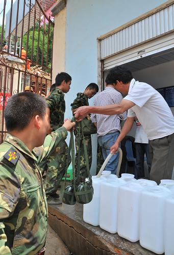 8月6日,云南建工集团工作人员向龙头山镇灰街受灾群众集中安置点的水箱内添加可直接饮用的矿泉水。新华社记者 黄勇 摄 |