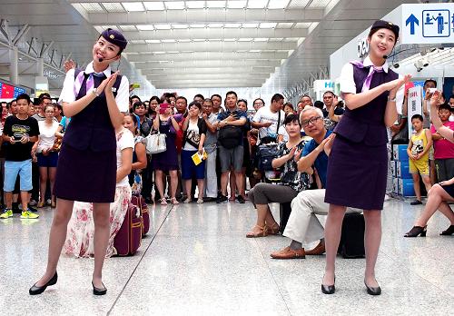 8月7日,高铁乘务员在火车站候车大厅表演的动感舞蹈吸引了众多观众。新华社记者 陈飞 摄