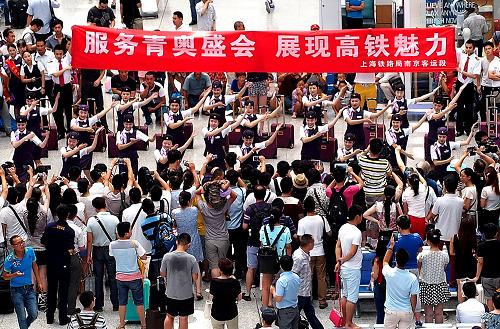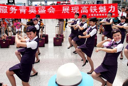 8月7日,高铁乘务员在火车站候车大厅表演动感舞蹈。当日,主题为“服务青奥盛会,展现高铁魅力”的公益快闪活动在上海虹桥火车站举行,上海铁路局南京客运段的乘务员以动感的舞蹈宣传青奥会并展示高铁乘务人员热情的风貌。2014年南京青年奥林匹克运动会将于8月16日在南京开幕,届时将有数以万计的运动员及游客乘坐高铁汇聚南京,参加这一盛会。新华社记者 陈飞 摄