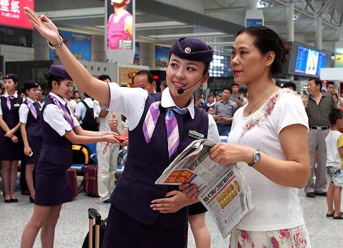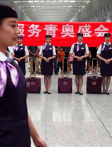 8月7日,高铁乘务员在火车站候车大厅以整齐的队列展示服务形象。新华社记者 陈飞 摄 |
