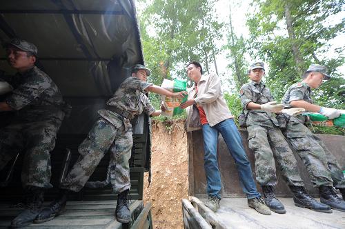 8月7日,第十三集团某红军师官兵在毗邻鲁甸县的巧家县新店乡为受灾群众搬运生活物资。新华社记者 陶亮 摄