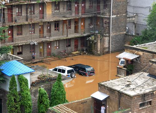 8月10日,在贵州省威宁县健康路,一居民小区停车场被洪水淹没。8月9日18时至10凌晨5时许,贵州省威宁自治县境内遭遇连续强降雨袭击,导致威宁县城部分等地段积水严重。新华社发(杨文斌 摄)