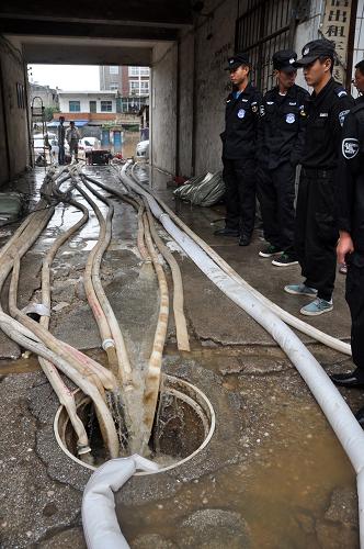 8月10日,在贵州省威宁县健康路一处被水淹没的停车场,水务部门工作人员正在用水泵排水。新华社发(杨文斌 摄)