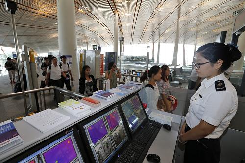 8月14日,在北京首都国际机场,首都机场出入境检验检疫局工作人员通过红外体温监测系统监控入境旅客体温,一旦发现体温异常者,将对其进行传染病排查。针对目前西非地区埃博拉出血热疫情,北京出入境检验检疫局及其所属的首都机场出入境检验检疫局实施一系列措施,如成立口岸疫情防控工作组织机构,启动口岸疫情防控应急预案,向航空公司、出入境人员、货物和快件承运人等普及埃博拉出血热相关知识及防控要点,提前获取重点航班旅客信息并对可能载有疫情发生地人员的航班实施严格的登机检疫,对来自疫情发生地的航空器、货物和行李实施严格的检疫处理等,切实做好防控工作。新华社记者 沈伯韩 摄