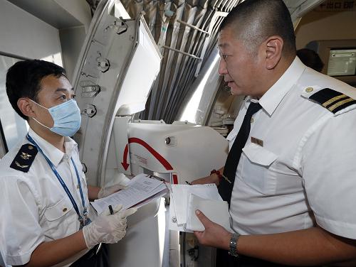 8月14日,在北京首都国际机场,一架来自德国法兰克福的航班刚刚抵达,首都机场出入境检验检疫局的入境航空器检验检疫人员张言敏(左)向乘务长了解机上旅客情况,尤其是是否有旅客存在发热发烧、呕吐等埃博拉出血热感染者可能出现的状况。法兰克福是西非埃博拉出血热疫区的旅客进入中国可能的中转地之一。新华社记者 沈伯韩 摄