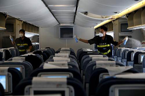 8月14日,在北京首都国际机场,一架来自德国法兰克福的航班抵达后,检验检疫人员在对机舱进行消毒防疫。法兰克福是西非埃博拉出血热疫区的旅客进入中国可能的中转地之一。新华社记者 沈伯韩 摄