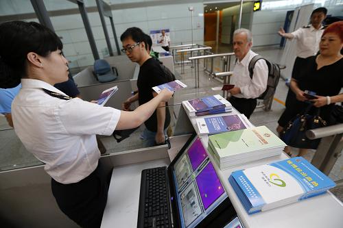 8月14日,在北京首都国际机场,首都机场出入境检验检疫局工作人员向出境旅客发放中、英文版埃博拉出血热防控知识手册,以提高旅客防控意识和能力。新华社记者 沈伯韩 摄