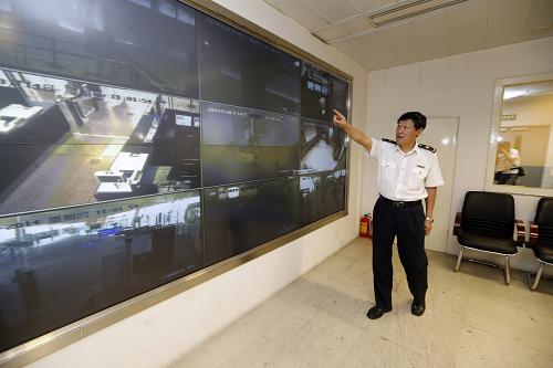8月14日,在北京首都国际机场,首都机场出入境检验检疫局航空器检疫处处长高军在向记者介绍视频监控室,墙上的大屏幕可以实时显示首都国际机场T2、T3航站楼所有旅检通道的旅客红外线体温监测数据,该套系统还能对这些数据进行存储,以便开展后续查验工作。新华社记者 沈伯韩 摄 |
