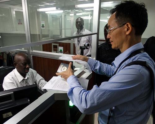 8月17日,中国援助塞拉利昂临床医疗专家组成员沙新平(右)抵达塞拉利昂首都弗里敦隆吉机场。新华社发
