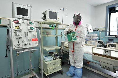 8月20日,山东省胸科医院的医护人员在可用于收治埃博拉病例的高等级隔离病房内检测设备,该病房为负压病房,循环空气经过特殊设备消毒。新华社记者 徐速绘 摄