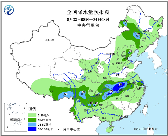 21日至23日,四川盆地大部、重庆北部和东南部、湖北大部、贵州东北部和西南部、湖南西北部、河南东南部、安徽西部、云南西部等地的部分地区有大雨或暴雨(50~80毫米)。 未来三天具体预报 8月21日08时至22日08时,青藏高原东部和南部、甘肃南部、四川盆地西部、云南西部等地的部分地区有中到大雨,其中,四川盆地西南部的局地有暴雨(50~70毫米),上述部分地区并伴有短时雷雨大风等强对流天气。黄海中东部和东南部海域、东海北部海域有6~7级、阵风8级的大风。 8月22日08时至23日08时,青藏高原东部和南部、甘肃南部、西南地区东部、云南西部、江西东北部、浙江东南部、河北北部以及黑龙江东部等地的部分地区有中到大雨,其中,四川盆地中部的局部地区有暴雨(50~60毫米),上述局部地区并伴有短时雷雨大风等强对流天气。 8月23日08时至24日08时,西藏东南部、川西高原南部、重庆东部、贵州西部和东北部、云南东北部、江汉、江淮西部、江南北部、河北东北部、内蒙古东部以及吉林西部等地的部分地区有中到大雨,其中,湖北中东部、河南东南部、湖南西北部等地的局部地区有暴雨(50~80毫米),上述局部地区并伴有短时雷雨大风等强对流天气。 |