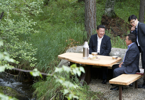 8月22日,国家主席习近平同蒙古国总统额勒贝格道尔吉在乌兰巴托市郊的总统官邸再次会晤。这是习近平同额勒贝格道尔吉会晤后在溪畔饮茶。新华社记者 黄敬文 摄
