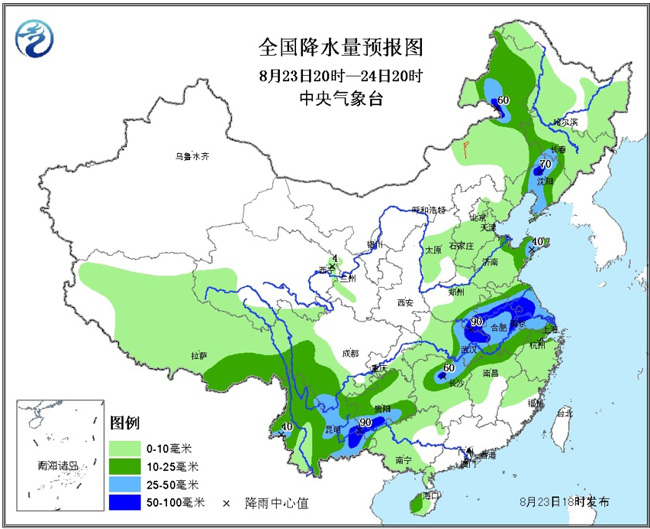 中央气象台8月23日18时发布暴雨预报:预计8月23日20时至24日20时,湖南东北部、湖北东部、河南东南部、苏皖大部、贵州南部、云南东部、四川南部、内蒙古东北部、辽宁中部、吉林西南部、山东半岛等地的部分地区有大到暴雨(50~90毫米),上述部分地区并伴有短时雷雨大风等强对流天气。 需要注意的是,未来三天,东北地区雷雨频繁,局地降雨较为激烈,公众要注意防御雷电、大风、冰雹等强对流天气,相关部门要注意防御城市内涝。 |
