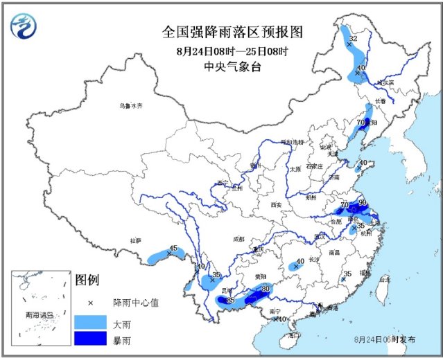 中央气象台8月24日06时继续发布暴雨预报。预计8月24日08时至25日08时,安徽中部和东南部、江苏中南部、内蒙古东北部、辽宁中部、山东半岛中部、广西西部、云南东南部和北部、西藏东南部等地的部分地区有大到暴雨(50~90毫米),上述部分地区并伴有短时雷雨大风等强对流天气。