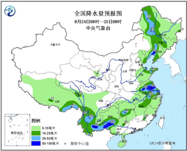 辽宁吉林等气象干旱区有较强雷雨。24~26日,辽宁、吉林等气象干旱区将出现小到中雨,其中,辽宁北部和中南部、吉林中部的部分地区有大雨,局地暴雨,并伴有短时雷雨大风等强对流天气。 未来三天具体预报 8月24日08时至25日08时,内蒙古东北部、黑龙江西部、吉林中西部、辽宁中南部、山东半岛、苏皖大部、江西北部、湖南中部、贵州南部、广西西部、云南大部、西藏东南部等地有中到大雨,其中,辽宁中部、安徽中部偏北、江苏中部、广西西部、云南南部等地的局部地区有暴雨(50~90毫米),上述部分地区并伴有短时雷雨大风等强对流天气。