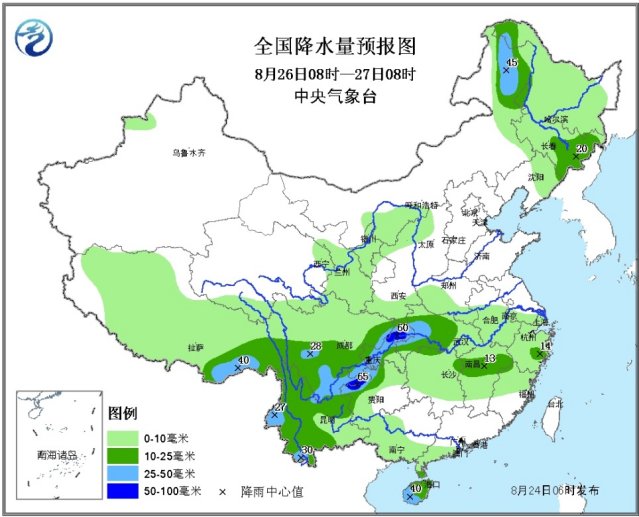 8月25日08时至26日08时,内蒙古东部、东北地区中部、江南中部、西南地区北部和南部、西藏东南部等地的部分地区有中到大雨,其中,内蒙古东北部的部分地区有暴雨(50~70毫米),上述局部地区并伴有短时雷雨大风等强对流天气。