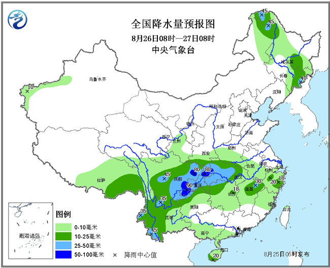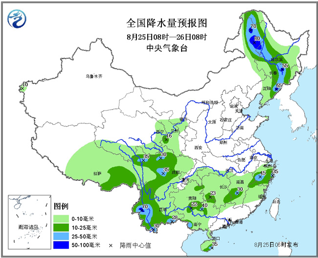 25~26日,内蒙古东部、黑龙江西部、吉林大部、辽宁中东部等地将有中到大雨,局地有暴雨(50~80毫米),上述部分地区并伴有短时雷雨大风等强对流天气。 26~27日,四川、重庆、湖北等地自西向东将有大到暴雨,局地有大暴雨(100~120毫米),上述部分地区并伴有短时雷雨大风等强对流天气。 未来三天具体预报 8月25日08时至26日08时,青藏高原东南部、内蒙古东部、黑龙江西部、吉林大部、辽宁东北部、四川西部、云南中西部、浙江中部、江西南部、广西北部等地的部分地区有中到大雨,其中,内蒙古东北部、黑龙江西南部、吉林东部、辽宁东北部、云南西部等地的局部地区有暴雨(50~80毫米),上述部分地区并伴有短时雷雨大风等强对流天气。