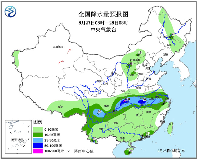 8月27日08时至28日08时,四川南部和东部、重庆、江汉、江淮、江南东北部等地有中到大雨,其中,重庆东北部、湖北西部和东部的部分地区有暴雨,局地大暴雨(100~120毫米),上述局部地区并伴有短时雷雨大风等强对流天气。