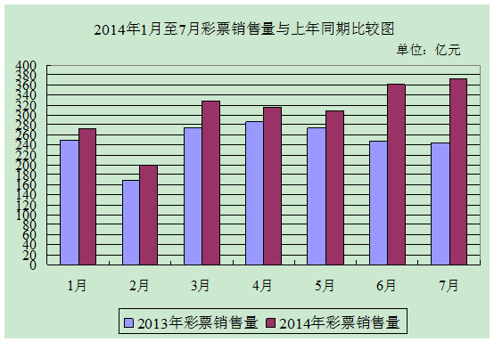 一、全国彩票销售情况 7月份,全国共销售彩票372.09亿元,比上年同期(简称“同比”)增加128.43亿元,增长52.7%。其中,福利彩票机构销售174.31亿元,同比增加33.19亿元,增长23.5%;体育彩票机构销售197.78亿元,同比增加95.24亿元,增长92.9%。本月彩票销售量大幅度增长的原因是第20届世界杯足球赛6月12日至7月13日在巴西举行,竞猜型彩票相应同比增加较多。 1月至7月累计,全国共销售彩票2156.19亿元,同比增加415.44亿元,增长23.9%。其中,福利彩票机构销售1159.33亿元,同比增加165.12亿元,增长16.6%;体育彩票机构销售996.86亿元,同比增加250.32亿元,增长33.5%。