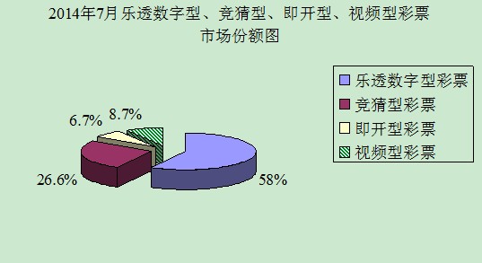 二、分类型彩票销售情况 7月份,乐透数字型彩票销售215.77亿元[1],同比增加41.96亿元,增长24.1%;竞猜型彩票销售98.93亿元,同比增加78.5亿元,增长384.3%;即开型彩票销售24.97亿元,同比减少0.65亿元,下降2.5%;视频型彩票[2]销售32.42亿元,同比增加8.62亿元,增长36.2%。7月份乐透数字型、竞猜型、即开型和视频型彩票销售量分别占彩票销售总量的58%、26.6%、6.7%、8.7%。 1月至7月累计,乐透数字型彩票销售1388.94亿元,同比增加190.99亿元,增长15.9%;竞猜型彩票销售350.08亿元,同比增加174.79亿元,增长99.7%;即开型彩票销售208.39亿元,同比增加1.99亿元,增长1%;视频型彩票销售208.79亿元,同比增加47.68亿元,增长29.6%。1-7月份乐透数字型、竞猜型、即开型和视频型彩票销售量分别占彩票销售总量的64.4%、16.2%、9.7%、9.7%。