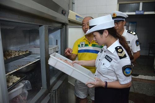 9月1日,新余市食品化妆品监督所执法人员在新余四中学生食堂检查肉品储存条件。新学期伊始,江西新余市组织卫生执法人员对全市中小学校(含托幼机构)食堂进行拉网式监督检查,严把食品原料关、场所布局关、加工制作关、人员健康关、餐具消毒关等环节,以保障师生饮食安全。新华社 周亮 摄