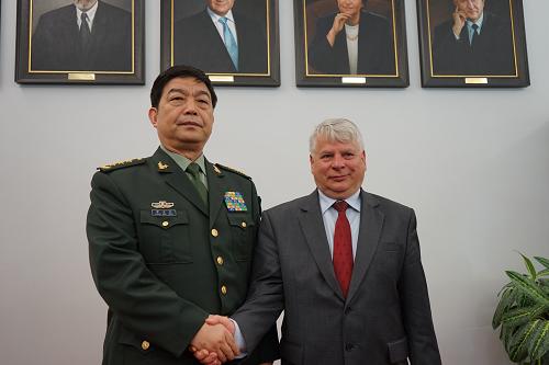 9月2日,在波兰华沙,波兰参议长波格丹·博鲁塞维奇会见正在波兰进行正式访问的中国国务委员兼国防部长常万全(左)上将。新华社记者 高帆 摄