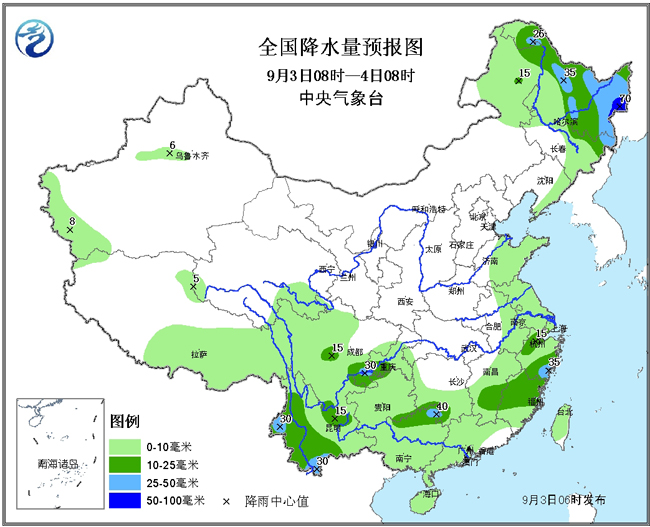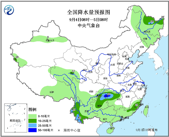 3~4日,东北地区北部、内蒙古东北部等地有中到大雨,其中,黑龙江东南部局地有暴雨(50~70毫米)。上述部分地区并伴有短时雷雨大风等强对流天气。 4~5日,四川盆地南部、重庆南部、贵州北部、湖南西北部等地的部分地区有中到大雨,局部地区暴雨(50~60毫米),3~5日,云南西部和南部等地部分地区有中到大雨。上述部分地区并伴有短时雷雨大风等强对流天气。 未来三天具体预报 3日08时至4日08时,内蒙古东北部、东部地区东部和北部、黄淮东部、江淮东部、江南东部和南部、华南、西南地区大部、西藏东部等地有小到中雨,其中,黑龙江中部和东部、广西北部、云南西部和南部等地的部分地区有大雨,黑龙江东南部的局部地区有暴雨(50~70毫米)。上述部分地区并伴有短时雷雨大风等强对流天气。
