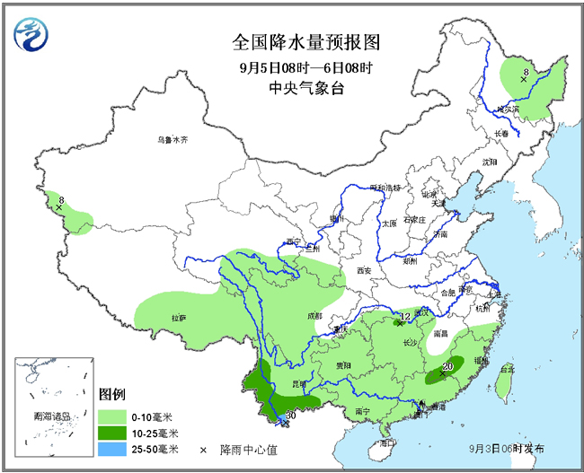 5日08时至6日08时,青藏高原中东部、西南地区大部、江南西部和南部、华南大部、黑龙江中东部等地有小到中雨或阵雨,局地有大雨(25~30毫米),上述部分地区并伴有短时雷雨大风等强对流天气。